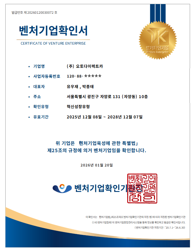 | 63 | [보도자료] 장기렌트·리스 전문 ‘오토다이렉트카’, 혁신성장유형 벤처기업 인증 획득 | 2026-01-20 | 조회수 : 2342 |